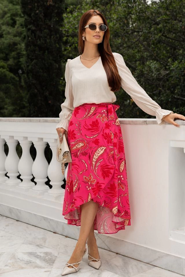 E a famosa saia pareô está nesse lançamento, lindíssima em uma viscose com estampa paisley, com flores e arabescos.