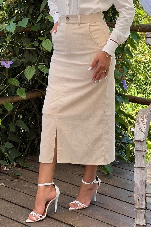 Uma saia feita no linho misto tem sua beleza natural, ela é versátil pode formar vários looks.