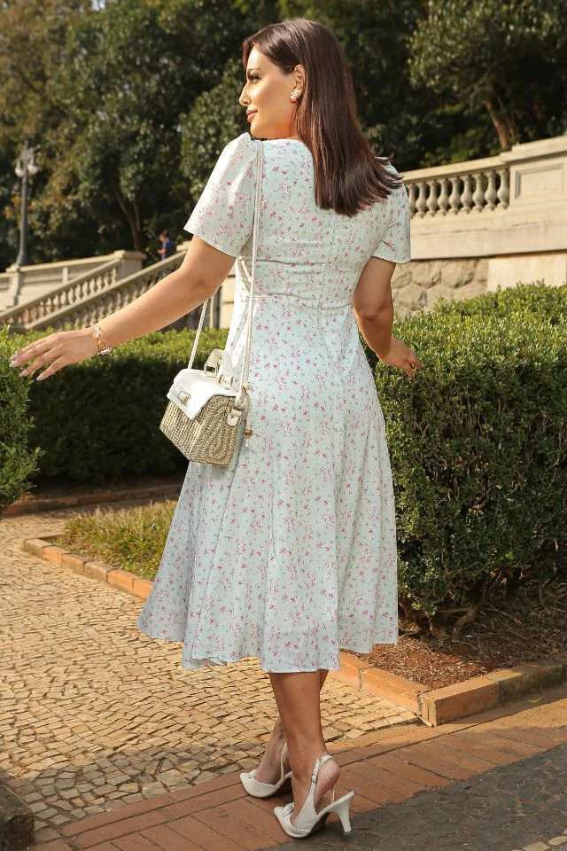 Os recortes abaixo do busto modelam a cintura, e a saia evasê tem movimento e fluidez.