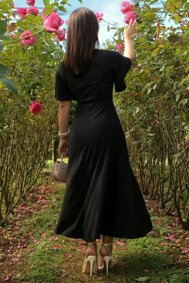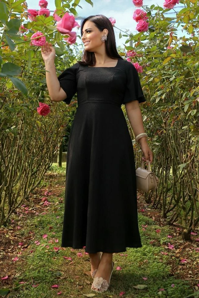 O crepe usado em sua construção, é extremamente confortável, o que permite ter o corpo ajustado por recortes que modelam sem perder o conforto. As mangas amplas combinam com o corte da saia maxi-midi, fazendo dessa proposta a escolha certa, juntando elegância, conforto e simplicidade.